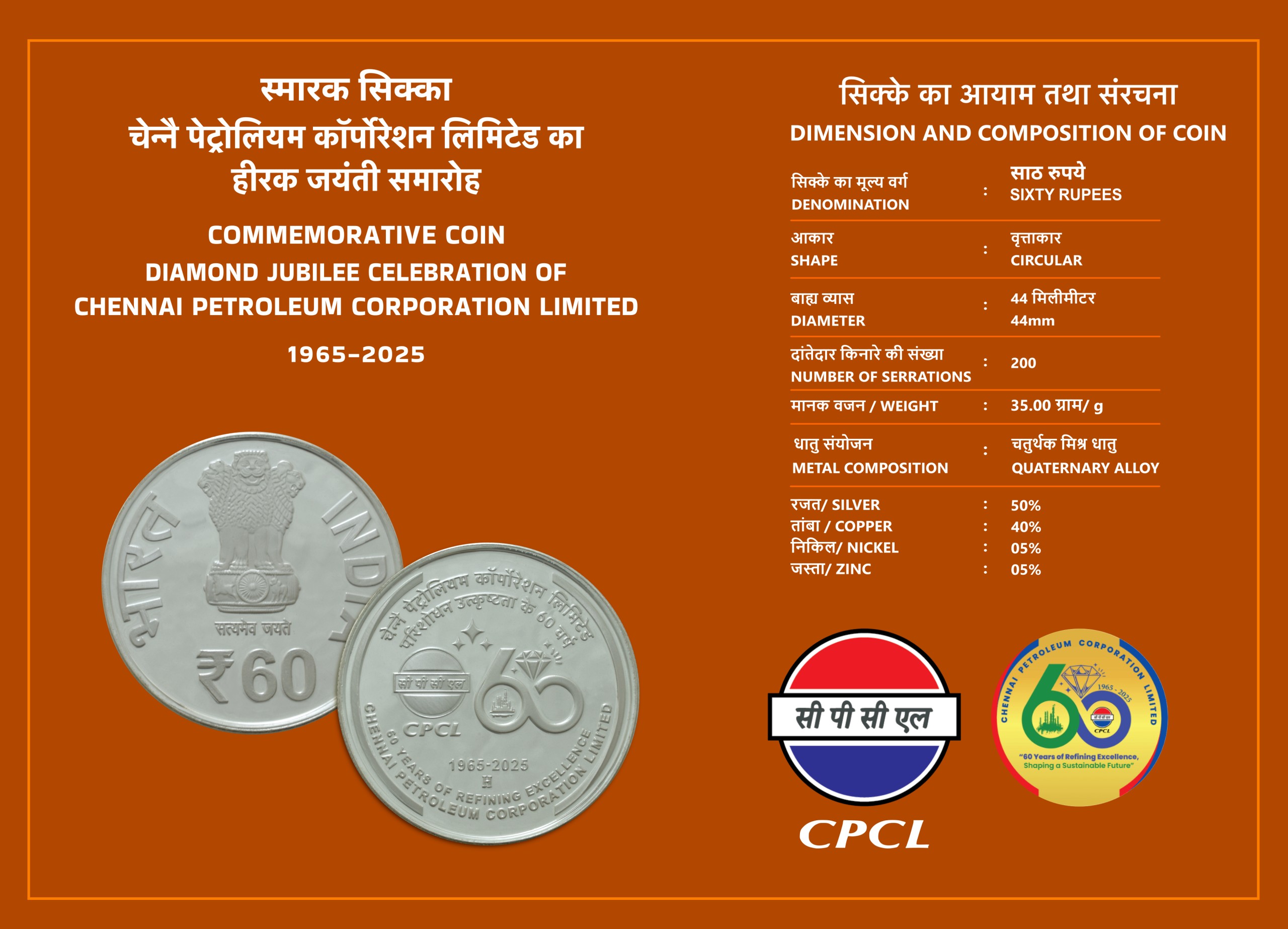 Diamond Jubilee Celebrations of Chennai Petroleum Corporation Limited | Rs. 60 Proof Coin | Kappa Box
