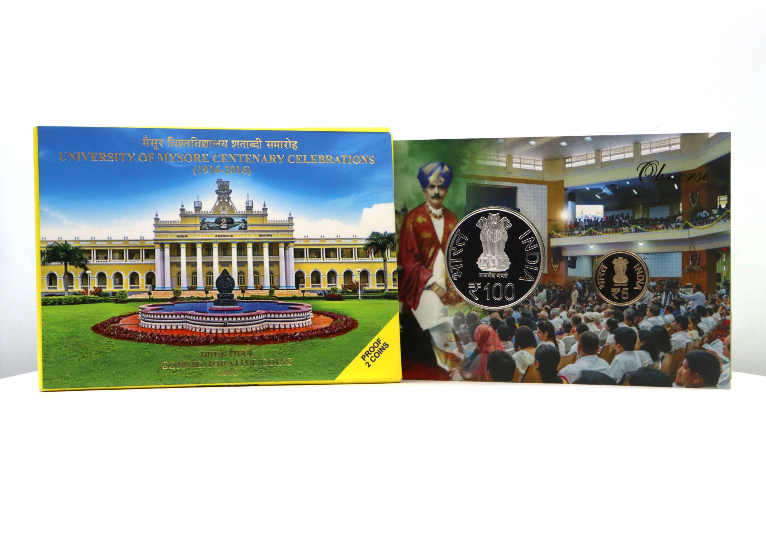 The University of Mysore was established on July 27, 1916. It is the sixth oldest in the country and the first in the state of Karnataka. The university was founded during the reign of Krishnaraja Wodeyar IV, the Maharaja of Mysore. Its first chancellor was the Maharaja of Mysore; the first Vice-Chancellor was H. V. Nanjundaiah. Also, in a sense it is the first university of the country to be established outside the limits of the British India. The university was founded as a result of the efforts of the benevolent and visionary Maharaja of erstwhile Princely State of Mysore His Highness Shri Nalvadi Krishnaraja Wadiyar – IV (1884-1940), and the then Diwan Sir M. Visvesvaraya (1860-1962). The University is located in Mysuru, the cultural centre of Karnataka. Mysuru was the capital of the Wadiyar dynasty. It is a city of palaces, temples, and gardens. Being a splendid tourist centre with historical monuments and unique architecture, it is famous for silk, sandalwood oil and artifacts of ivory and sandalwood. Quaternary Alloy: One Hundred Weight-35.00gms Serration-200 Diameter-44mm Silver-50% Copper-40% Nickel-5% Zinc-5% Nickel Brass – Five Rupees Weight-6.00 gms Diameter-23mm Serration-100 Copper-75% Zinc-20% Nickel-5%
